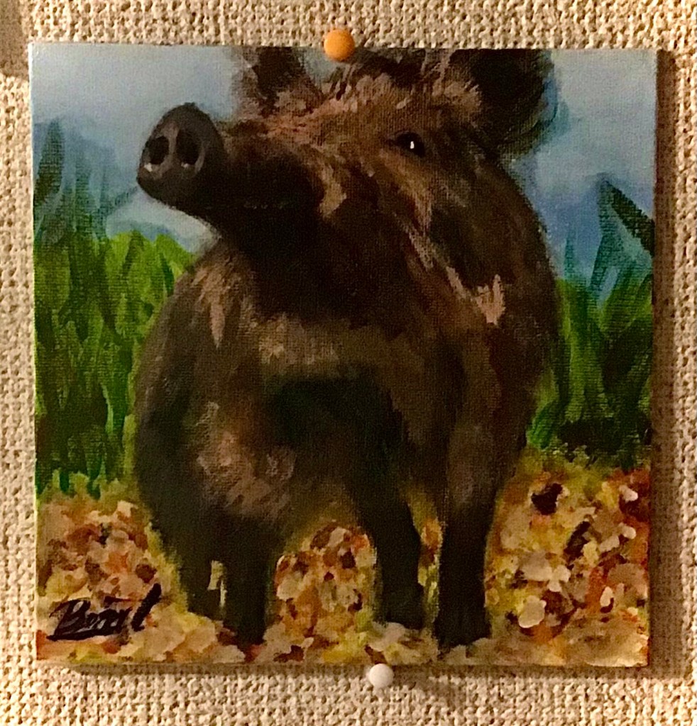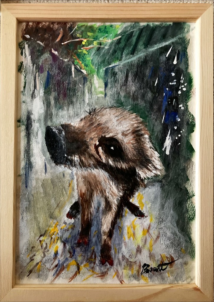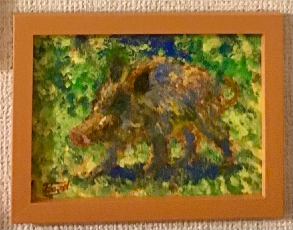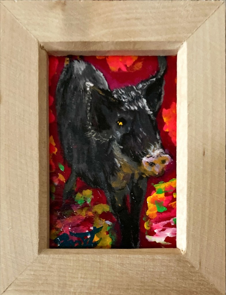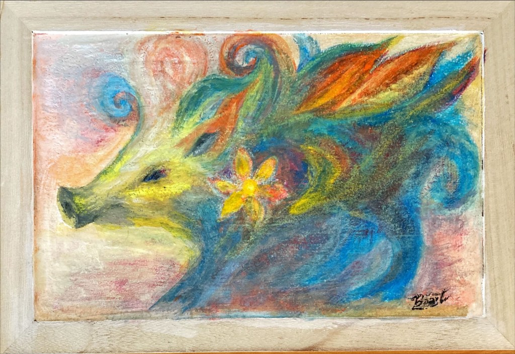 暗がりに浮かぶ、うり坊の姿。 その毛並みは、秋の光に染まる稲穂のよう。この作品は、野生の命が持つ「柔らかさ」と「孤独」を描いています。 背景に広がる深い色彩は、里山の夕暮れや、記憶の奥に沈む風景を想起させ、見る者の内側に眠る感情をそっと揺り起こします。