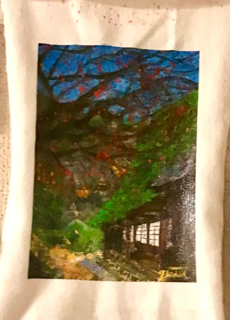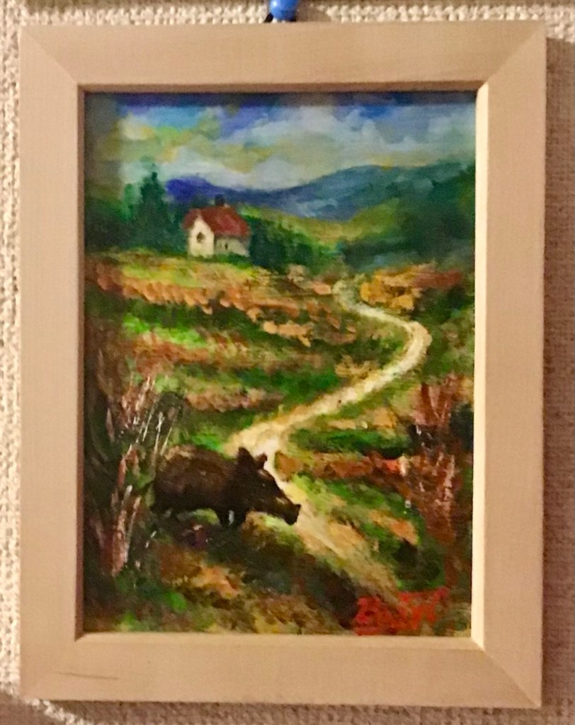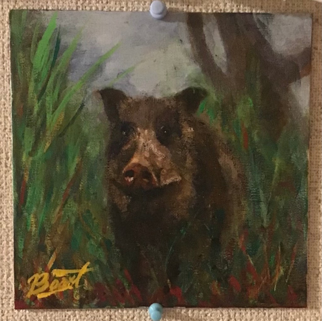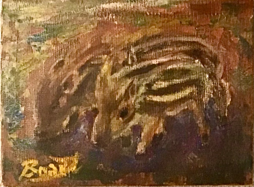 暗がりに浮かぶ、うり坊の姿。 その毛並みは、秋の光に染まる稲穂のよう。この作品は、野生の命が持つ「柔らかさ」と「孤独」を描いています。 背景に広がる深い色彩は、里山の夕暮れや、記憶の奥に沈む風景を想起させ、見る者の内側に眠る感情をそっと揺り起こします。