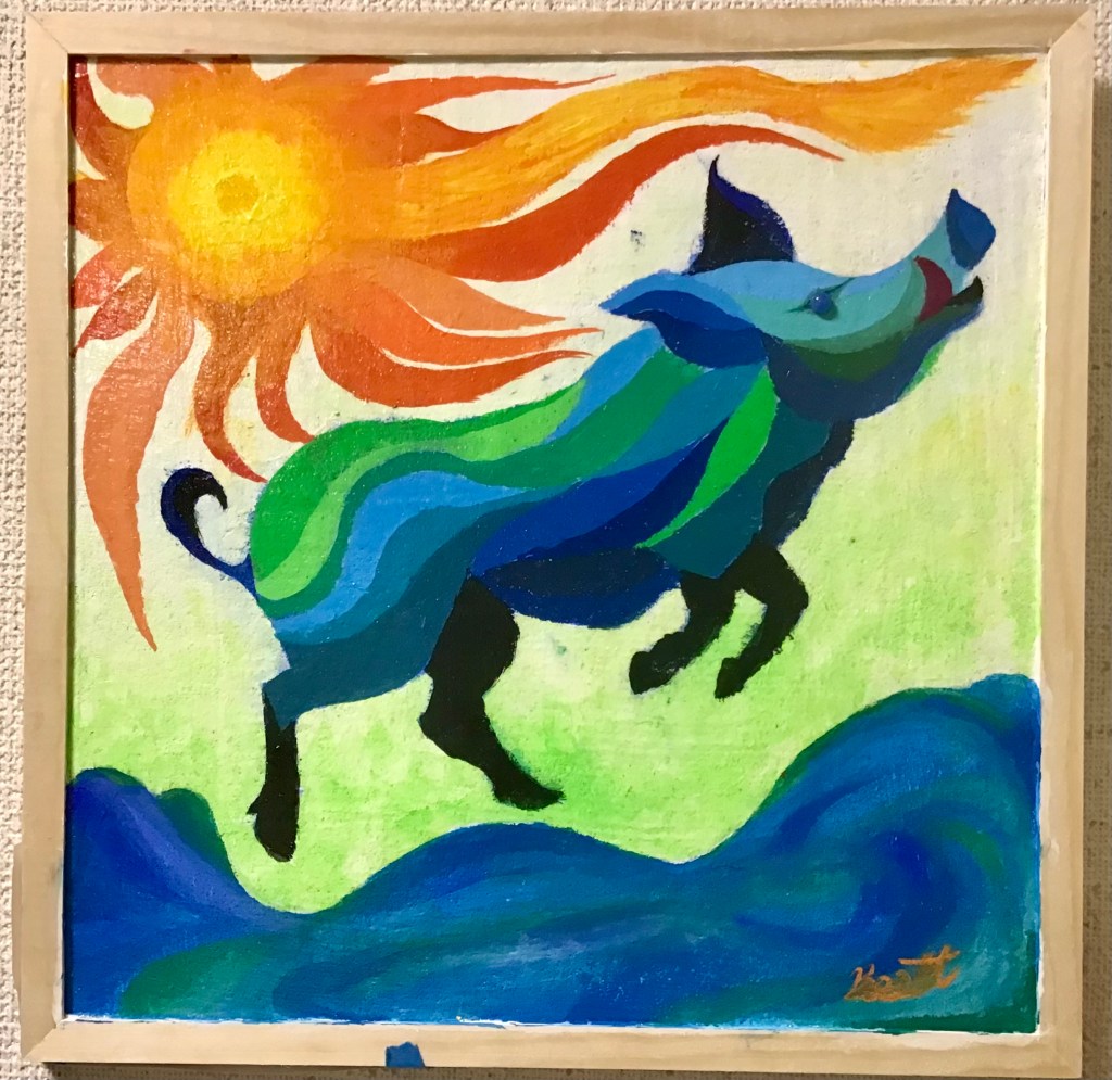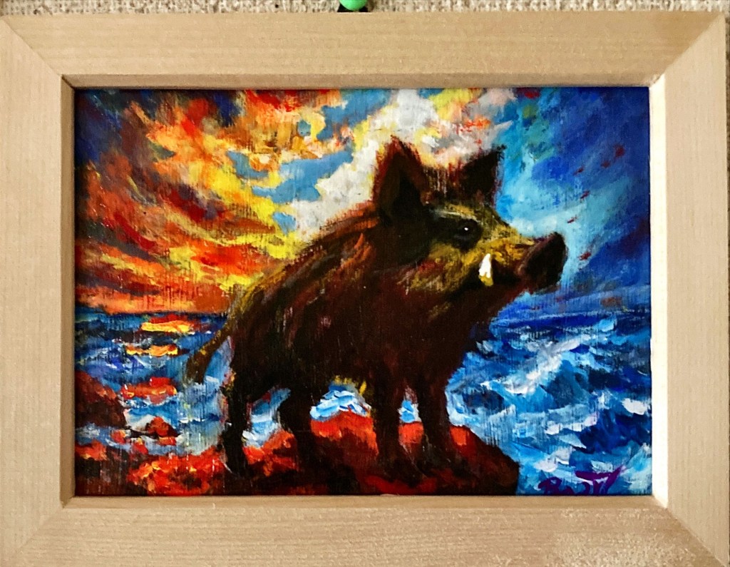猪は山を離れ海をも駆ける。 その姿は、記憶の深層から跳ね上がる創造の原型。 太陽は、過去と未来の狭間に灯る意志の象徴。本作は、まだ語られていない物語の使者として、 海上に現れることで、私たちの内なる変容を問いかける。