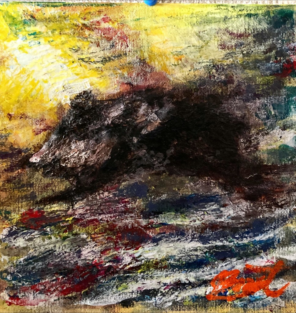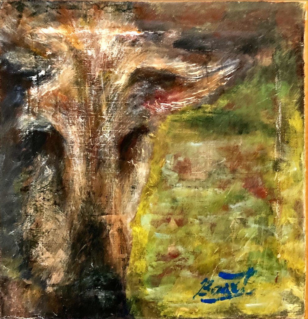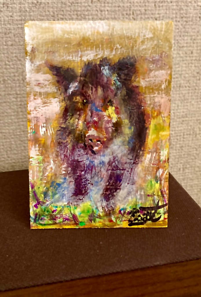 この眼差しは、山を駆ける記憶か、それとも霧の中に潜む問いか。猪の顔の一部を切り取ることで、見る者に「部分から全体」を想像させる余白を残す。背景の色彩は、山の気配と季節の揺らぎを抽象的に表現。 これは、静けさの中に潜む力を描いたひとつの肖像。