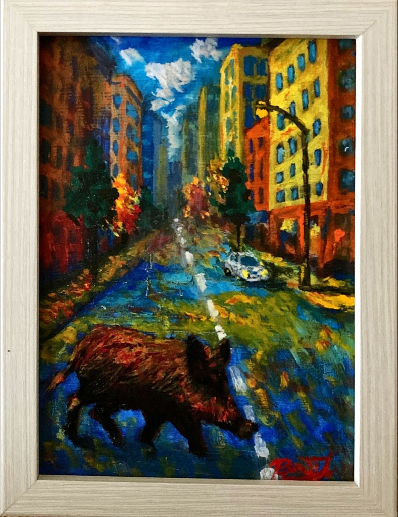 濡れた舗道に灯りが滲む都市の夜。 人の営みが眠りに向かう頃、 一頭の猪が静かに通りを横切る。それは、忘れられた野性の記憶か、 都市の奥底に潜む魂の象徴か。